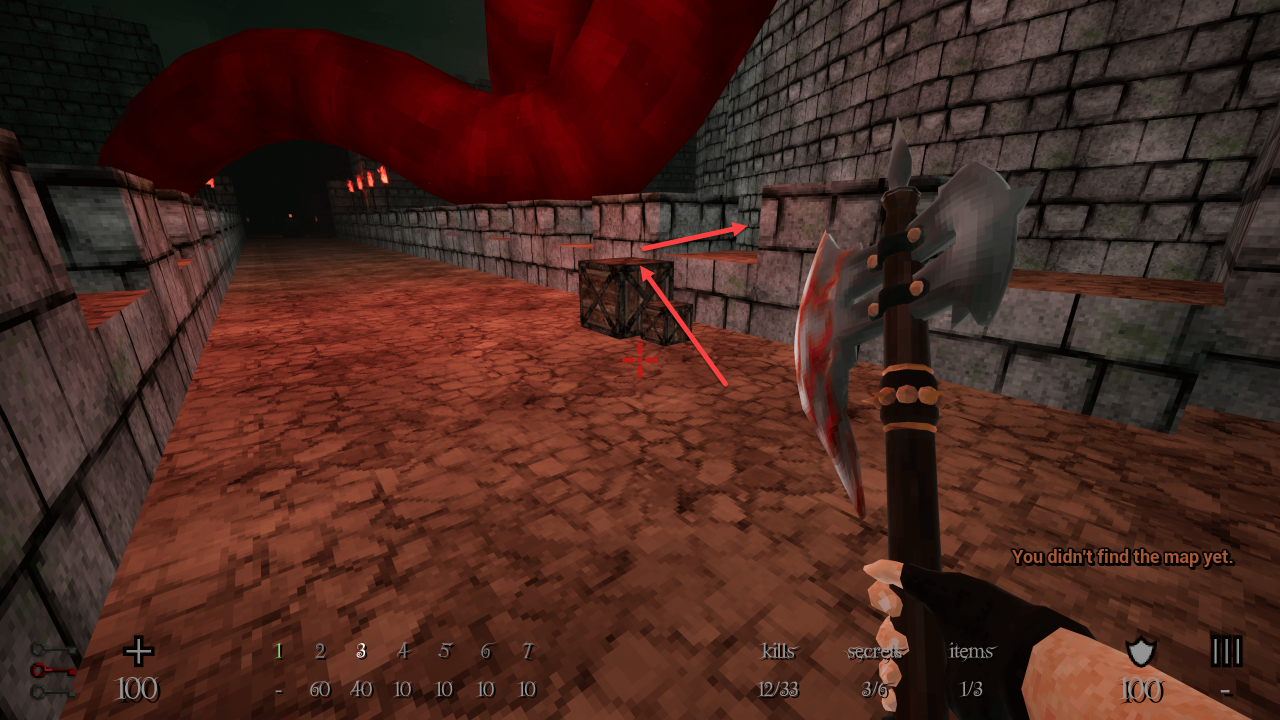 After clearing some more enemies and activating switches, you’ll end up at some point with a very large “C”-shaped room, outside, with a lot of blood and Chutulu heads on the walls. Take the first arch on the right with red torches. There will be a door on the right. On the left of this door, there’s a breakable wall. That’s Secret #2.