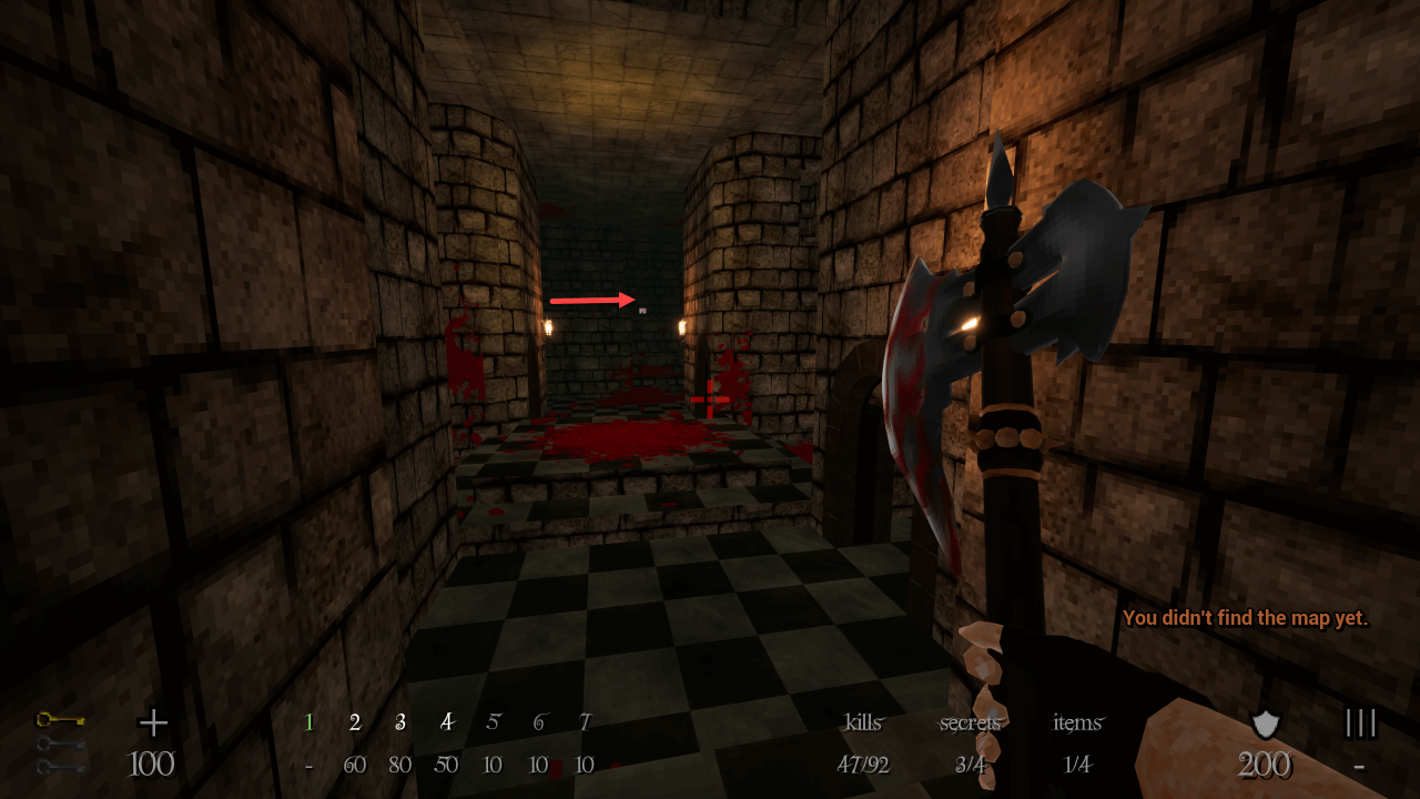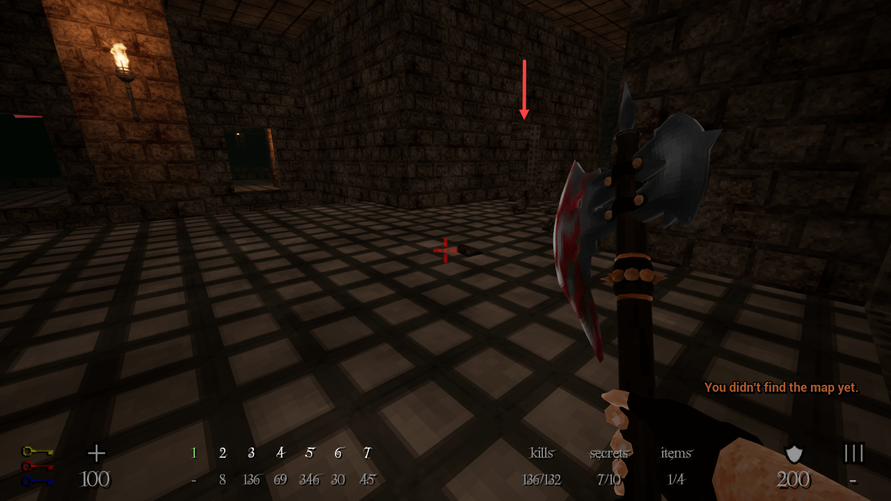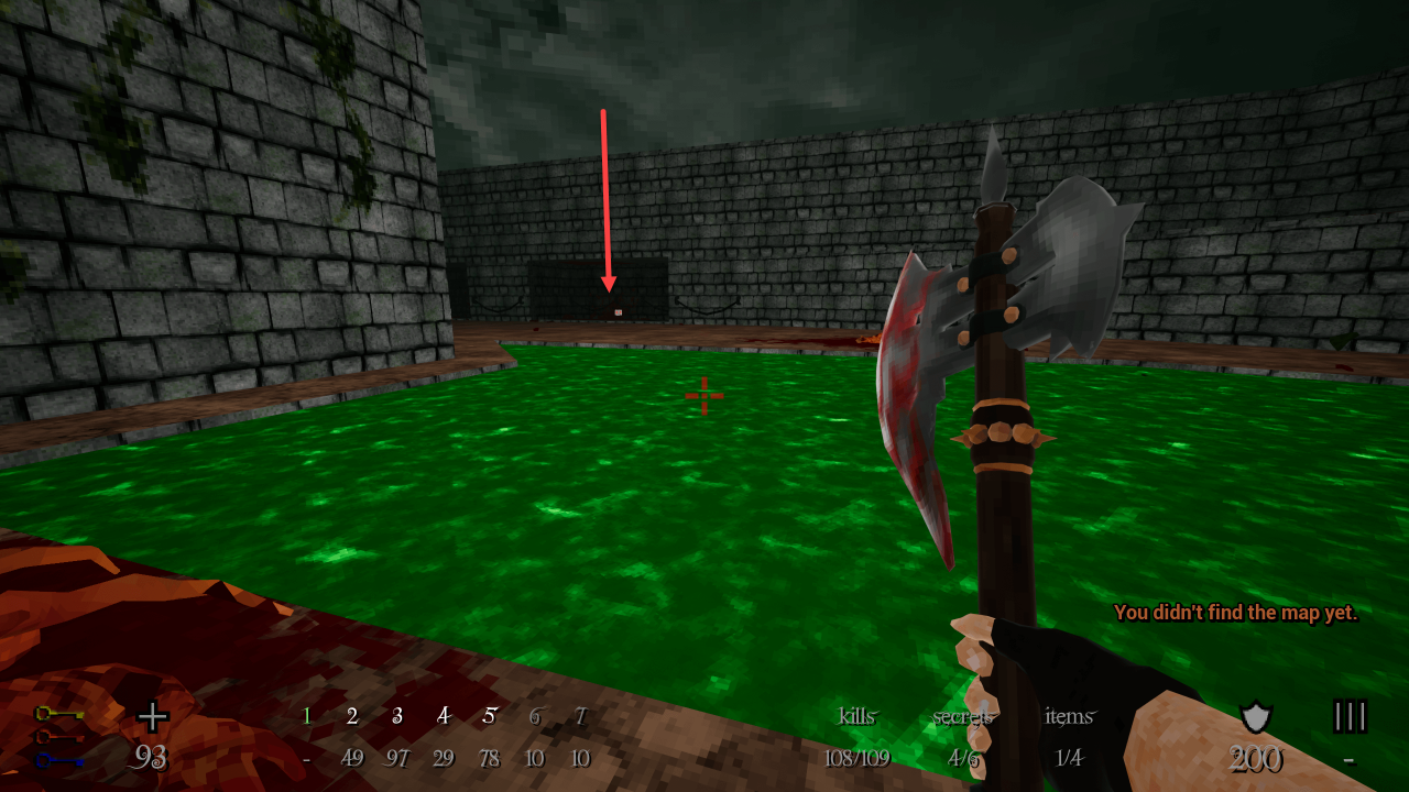 Go back near the yellow key room. A bit before this room, look on your left. There will be a black spot on the wall. Hit it with your axe to reveal this secret. The map and the megasphere are inside.