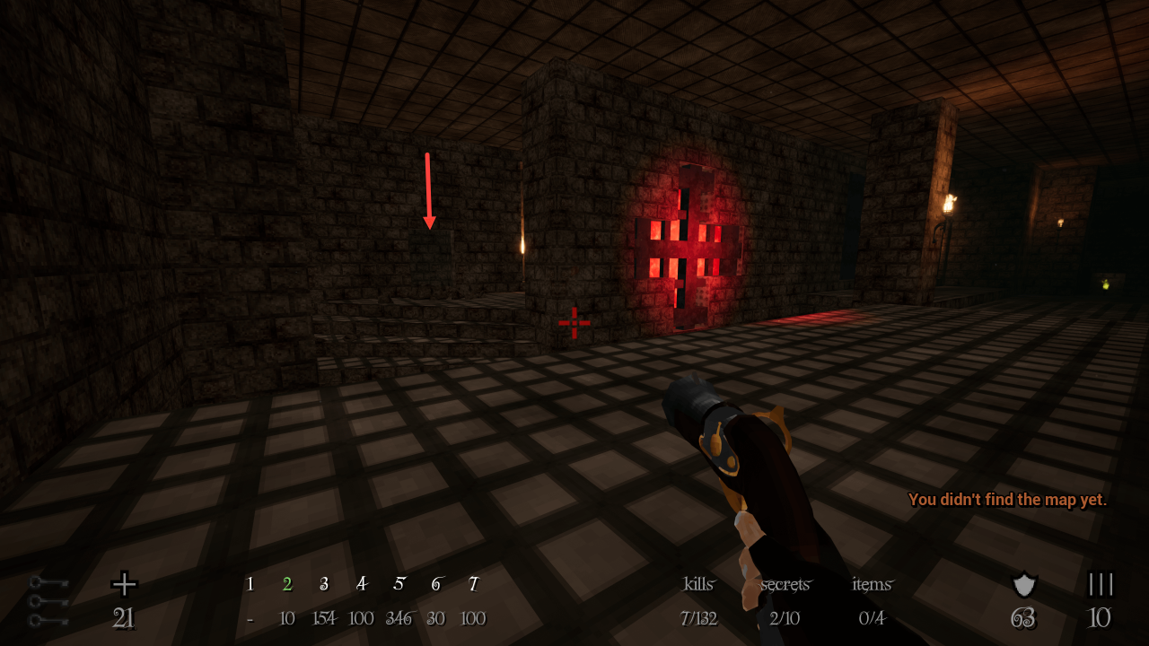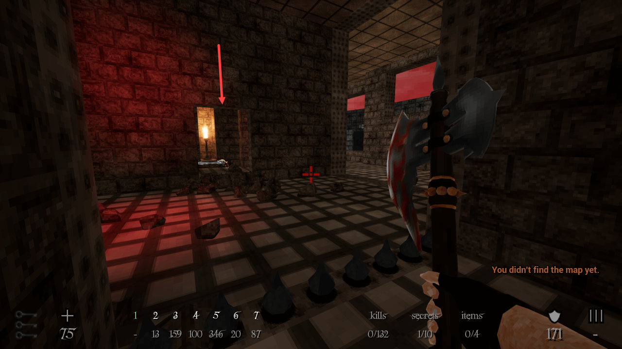 Before entering the cauldron room with blood around it, hit the left wall at the end of the corridor to find this secret. There is a weapon here.