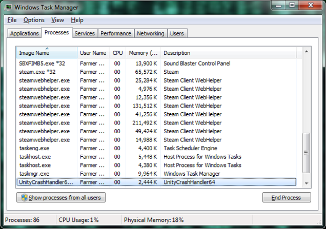 Scroll Down til you see the UnityCrashHandler64 process Click it to highlight it.