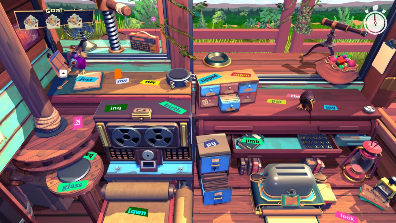 Pick up the battery found on the cassowary blanket in the bottom right corner. Put the battery in the radio by the cassowary food dish. Afterwards two aliens appear, have both kiwis in the circles and imitates the aliens. Once the aliens pick up the scarecrow it will drop the rock.