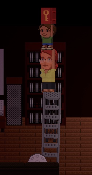 But that’s enough of secret passages and tools and hidden objects. It’s time to bring out the big guns! Going back to the locked case in the secret room, it’s time to get the key. You probably already saw where it was, above the TV in the living room. The simplest way to get it is to get the ladder and stack two characters on top of each other. Have the tallest one grab the book and tada! Not as complicated as originally thought.