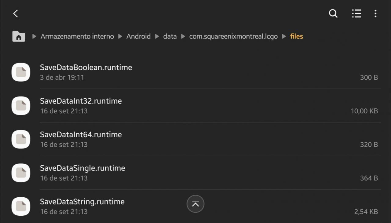 Save data for most apps is saved at Android\data, and guess what, so is this game’s save files. So, if we head to Internal Storage -> Android -> data -> com.squareenixmontreal.lcgo -> files, we should find this:
