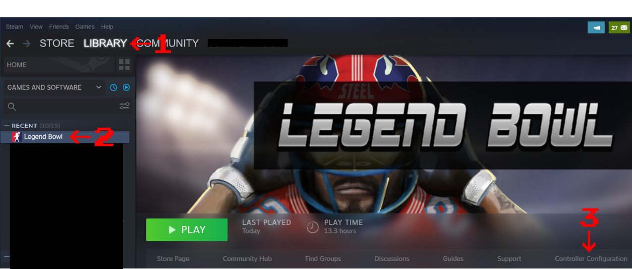 - Click “Library” select “Legend Bowl” then click “Controller Configuration”