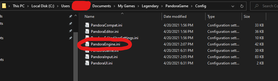 C:\Users\(YourUsername)\Documents\My Games\Legendary\PandoraGame\Config