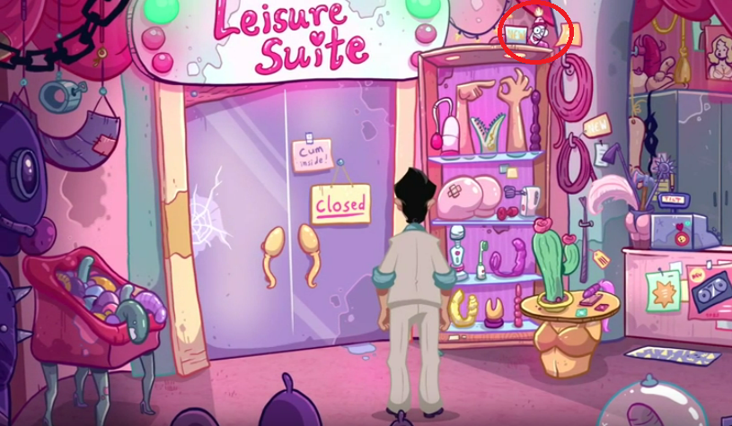 Once you open up the ability to travel to to the Leisure Suite, head inside and look up towards the top of the shelf in the middle of the room. Click on everyone’s favorite Dildo to unlock this achievement.