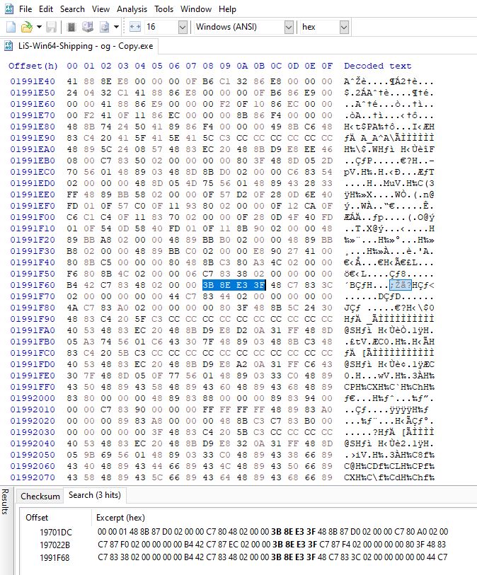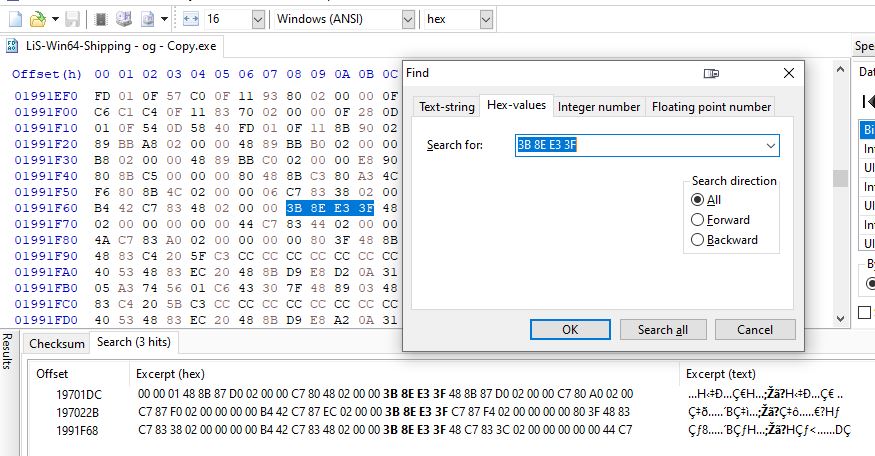 Find and replace (Ctrl-F —> Hex-values) 3 instances of 3B 8E E3 3F with: