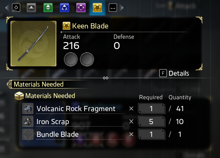Go to the arms dealer near the Blacksmith’s store, and buy the required amount of Bundle Blades (again, for example, 34). Proceed to the blacksmith, and buy about 100 of each material needed to craft the two following swords that stem from the Bundle Blade crafting tree.