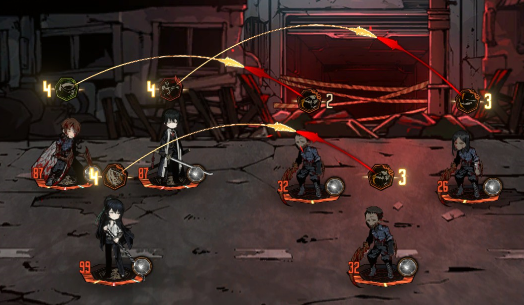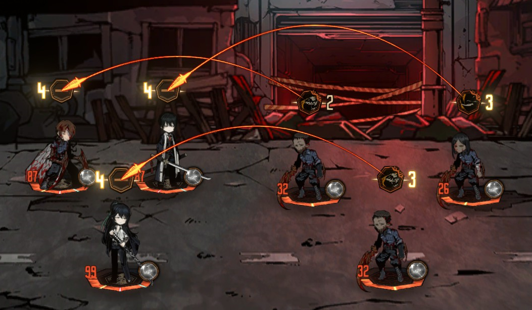 This is relatively straightforward assuming an equal number of attacks and enemies. However, in the event of more attacks, attacks will ‘rollover’ and will begin targeting left-to-right once more. Similarly, if a character is performing more than one attack, characters will prioritize clashing with all of those attacks before continuing to target further characters.
