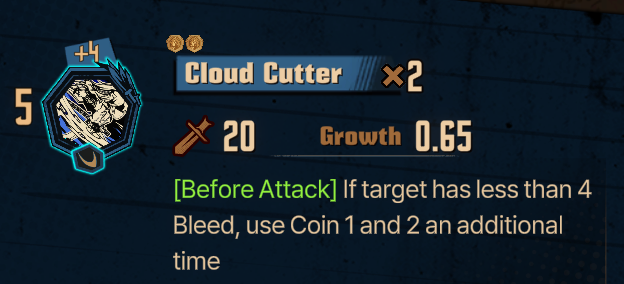 Let’s take an example to really showcase this, with Hong Lu’s Kurukumo Wakashu identity. His second skill is as follows, having a base 5 damage, gaining 4 with each heads, and having two attack coins to flip. Notably, his passive gives him bonus two coins on damage (not clash) if the enemy doesn’t have 4 bleed.