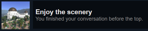 Now all that’s left for this playthrough is reach the top. Be sure to always continue through the dialogue. Choices do not matter. If you finish your conversation before reaching the top, you will earn Enjoy the scenery.