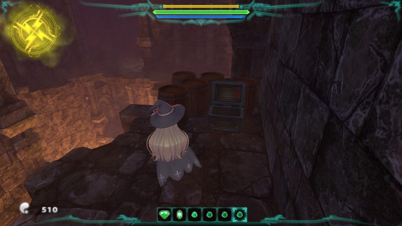 14. Starting from the crossroad again, head to the right after you unlocked the path, before heading up the staircase, go to the left and break a fake wall, defeat a laser shooting ghost and a red eye ghost, then proceed further down and break another fake wall behind the ghost, go down and you should find the 14th chest. This chest contains WIND .
