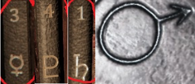 Then we go to the library on the 1st floor. Some books will have numbers and symbols underneath them. And we are looking for books in accordance with the code from the first screenshot (3410). (0 there is no book).