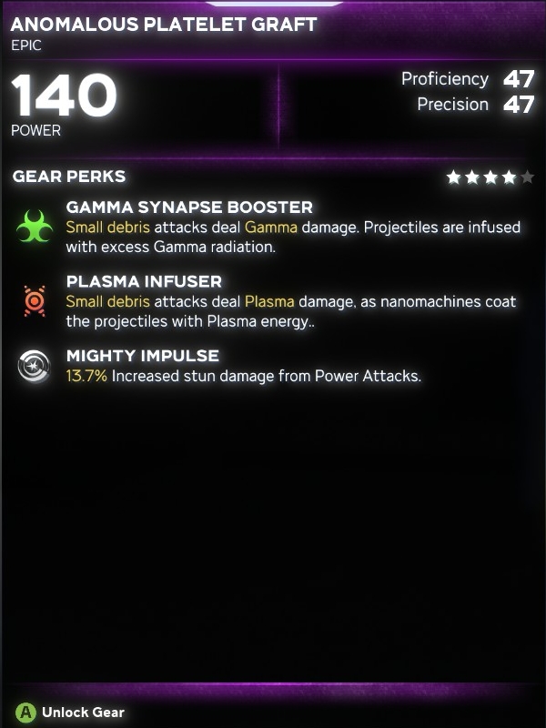Note: This makes the Anomalous Platelet Graft ranged item, which is generally considered to be somewhat useless, to be quite useful if it has two small debris attack perks. The lack of stats make it less so on some endgame areas, but until that point it is a very effective gear piece to help create battery effects.