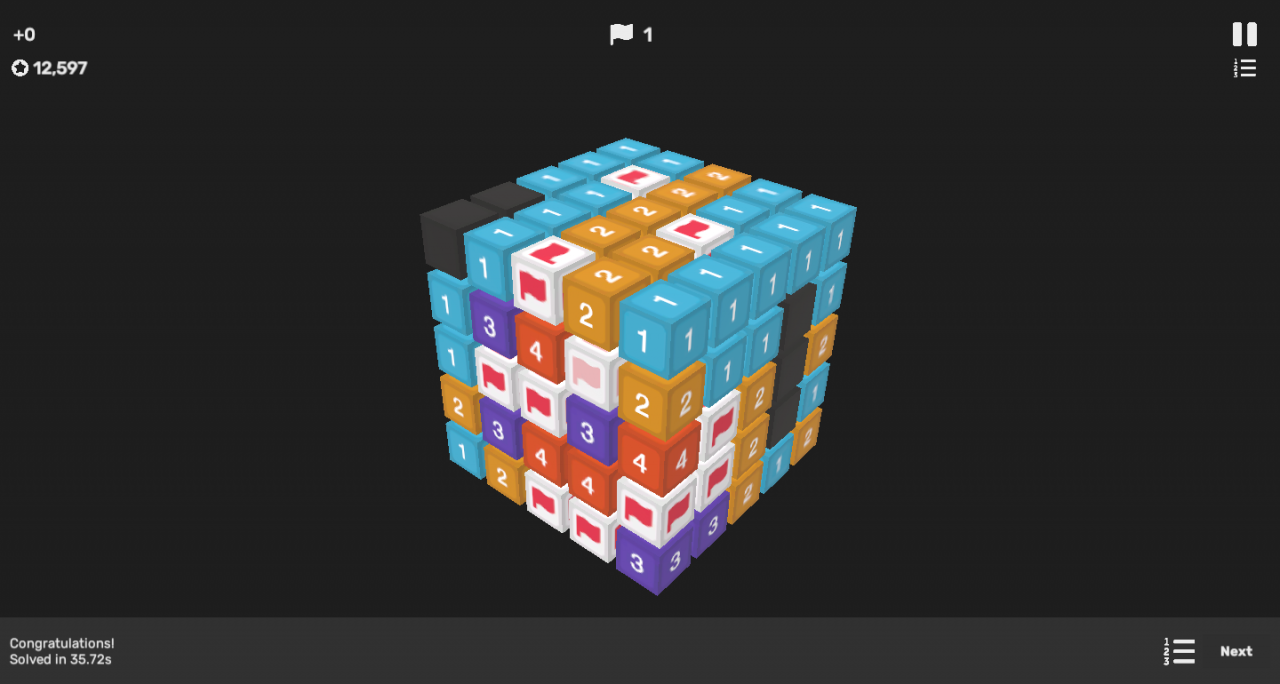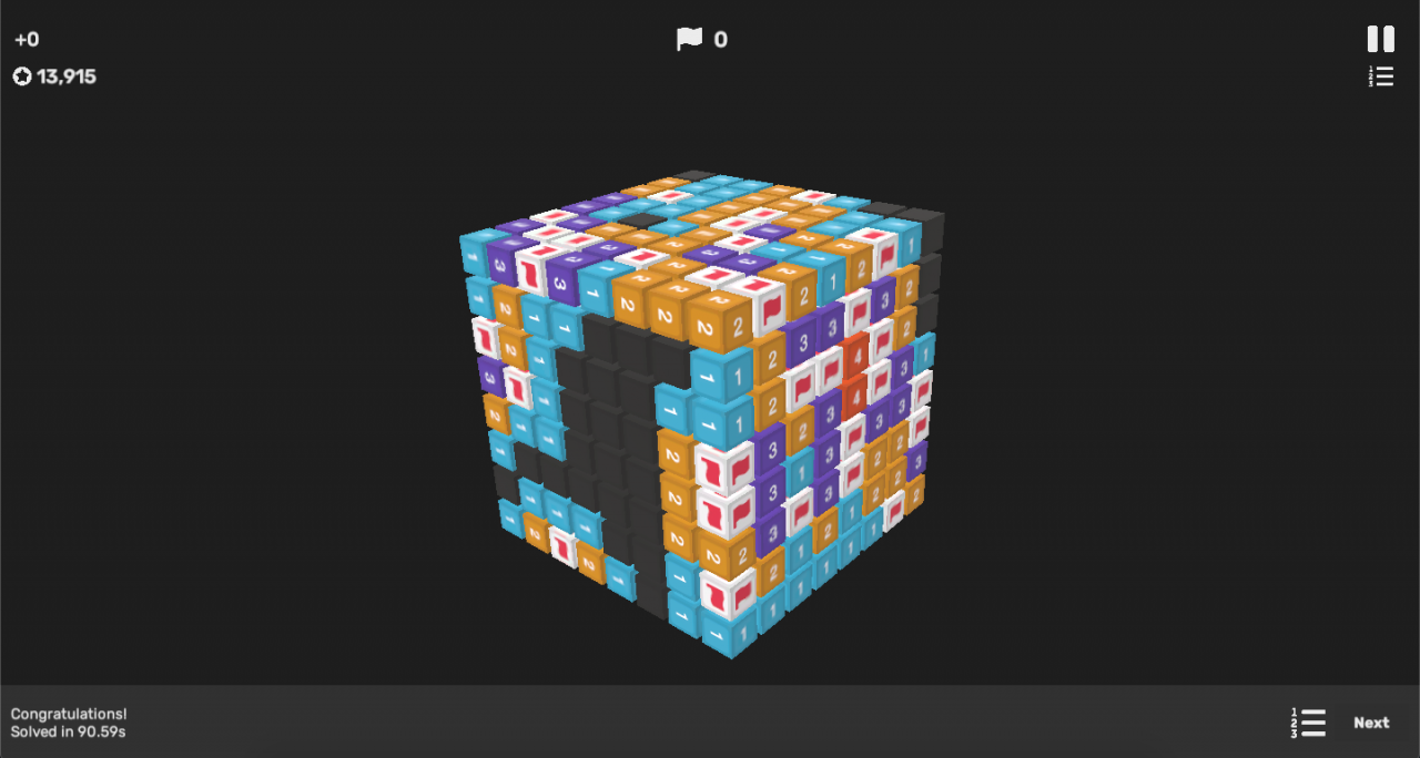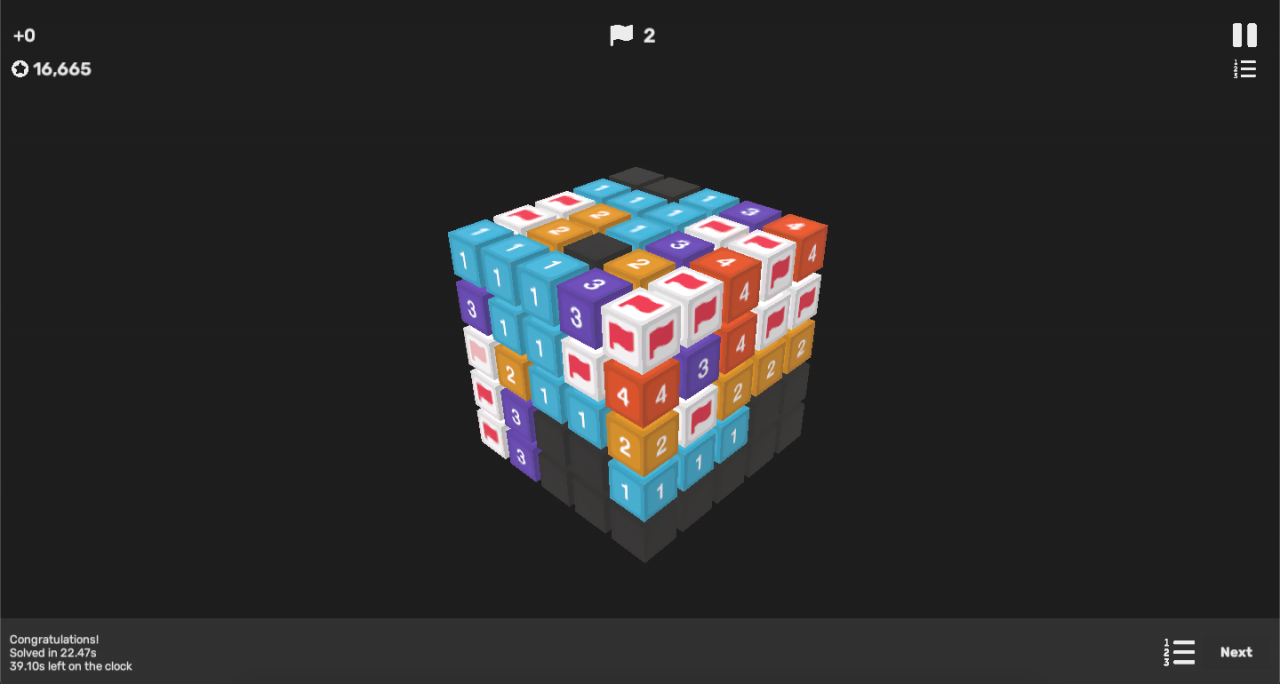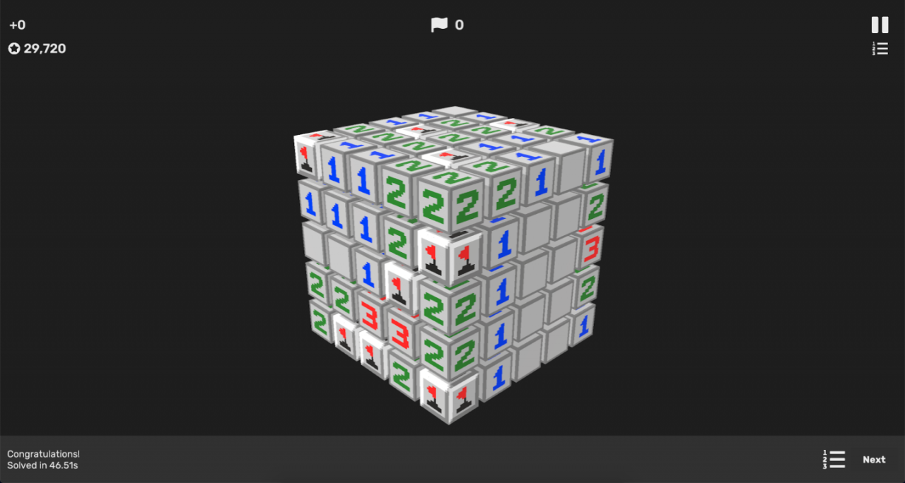 Once again take it very slow and think through your moves; there is no time limit to worry about. You could also run into 50/50s. If that happens just hope that you guess right, or you could use a Sonar powerup to find the mines location, but this will invalidate that cube’s solve time from the leaderboard.