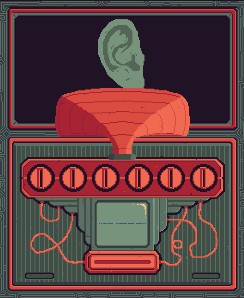 Listen to the sequence and turn the knobs to match it. Horizontal knobs represent long frequencies, vertical ones are for the short tones. To confirm your input press the big red button on the bottom. Each time a sound is played a visual clue also appears on each side of the ear, long lines for a long sound and short lines for a short sound.