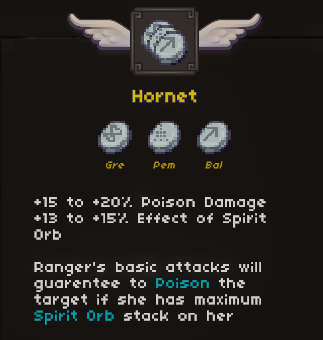 Hornet is, on paper, posion’s best applier unique. With only a trivial investment in attack speed, Hornet can easily cap poison stacks, opening itemization towards crit and crit multiplier.