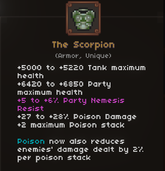 • If you aren’t running Prolonged Poison and Scorpion together, find a non-unique armor with good health, resists and healpower.