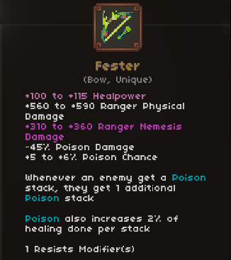 Poison is one of the many ways of dealing damage in MiniHealer. Unlike other options, there are many ways to build Poison – I’m certain variants exist that I did not discuss here. As the game is still in active development, I can only hope that more options are added: for example, uniques that care about when poison stacks expire or are removed; some intersection between poison and channeling; or perhaps something that changes Poison to scale from a different character or Healpower.