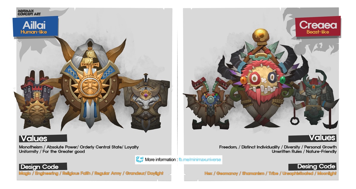 In MINImax Tinyverse you (the “max”) take part in 1v1 battles between armies of tiny 20-50 mm tall beings called MINIs. Each army has a powerful champion with unique skills and attributes, who is joined by a rabble of troopers who fight alongside them. And in the Tinyverse, you should choose to lead and support one realm of the two, Aillai vs. Creaea.