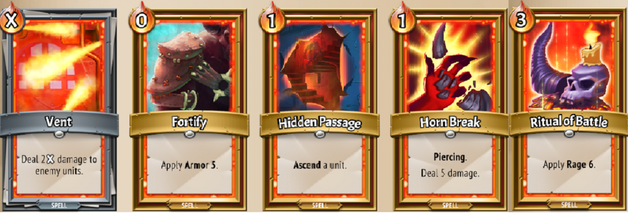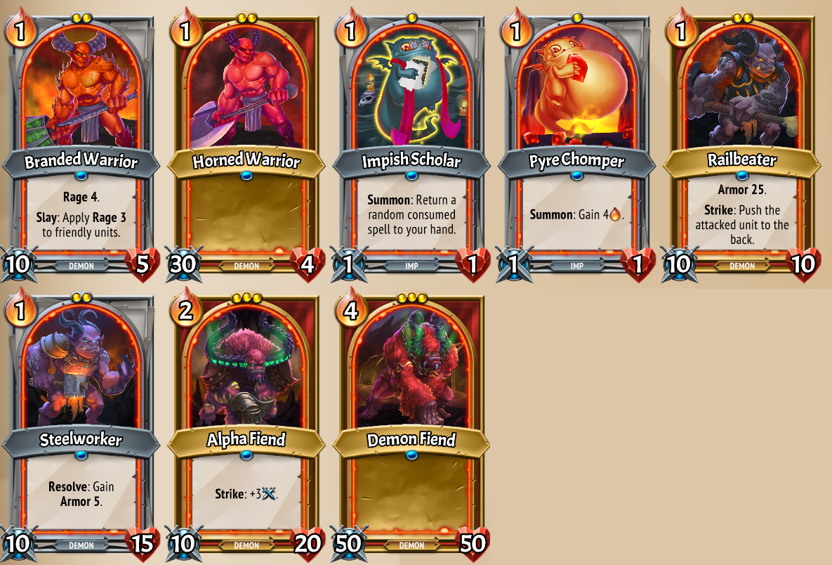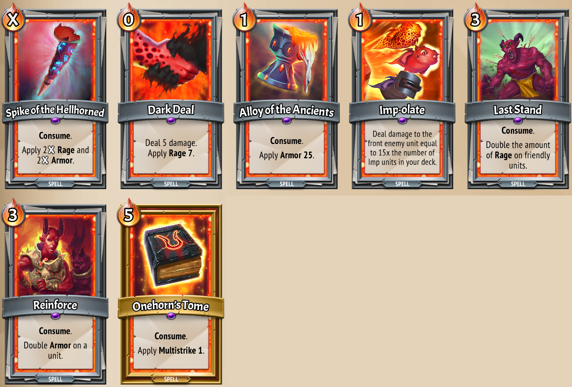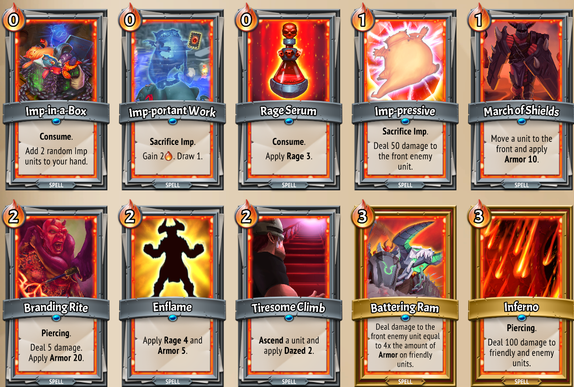 Scorched Steel: Friendly units enter with Armor 5. Fine but boring, your imps should still die if you need them to.