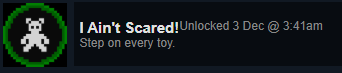 1) After picking up the kitchen key, you’ll see a clown toy on your way to the kitchen. It appears after interacting with the entrance door for the first time and disappears when you leave the scene. You need to step on it 8 times (for me, it was more than 8 so make sure to step on it a bit more.) If you do that, the wall next to the tape recorder will have an opening. Enter the opening for the first secret: