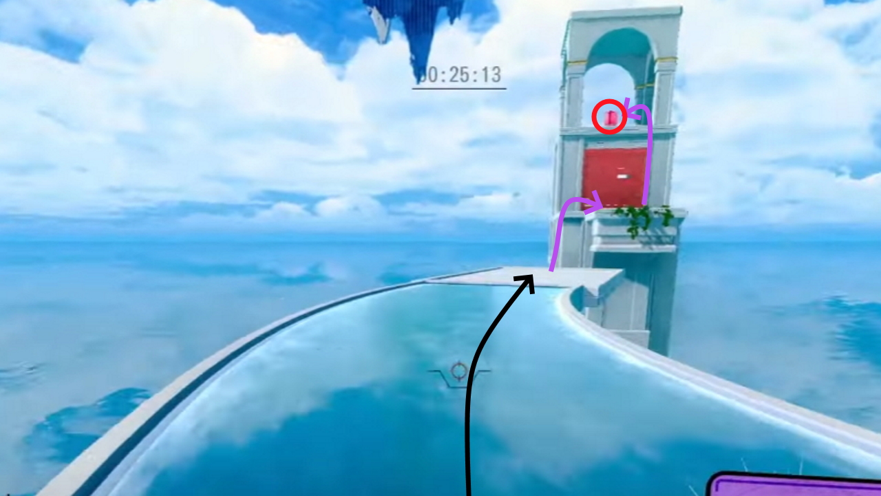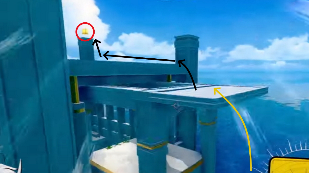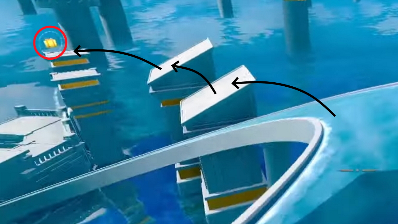 Head to the end of the level, where the water ring is. The gift is sitting on top of a pillar to the left. Run along the water ring and jump along the pillars to reach it.