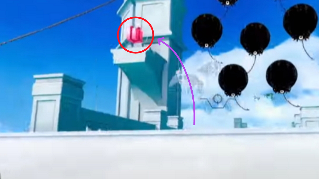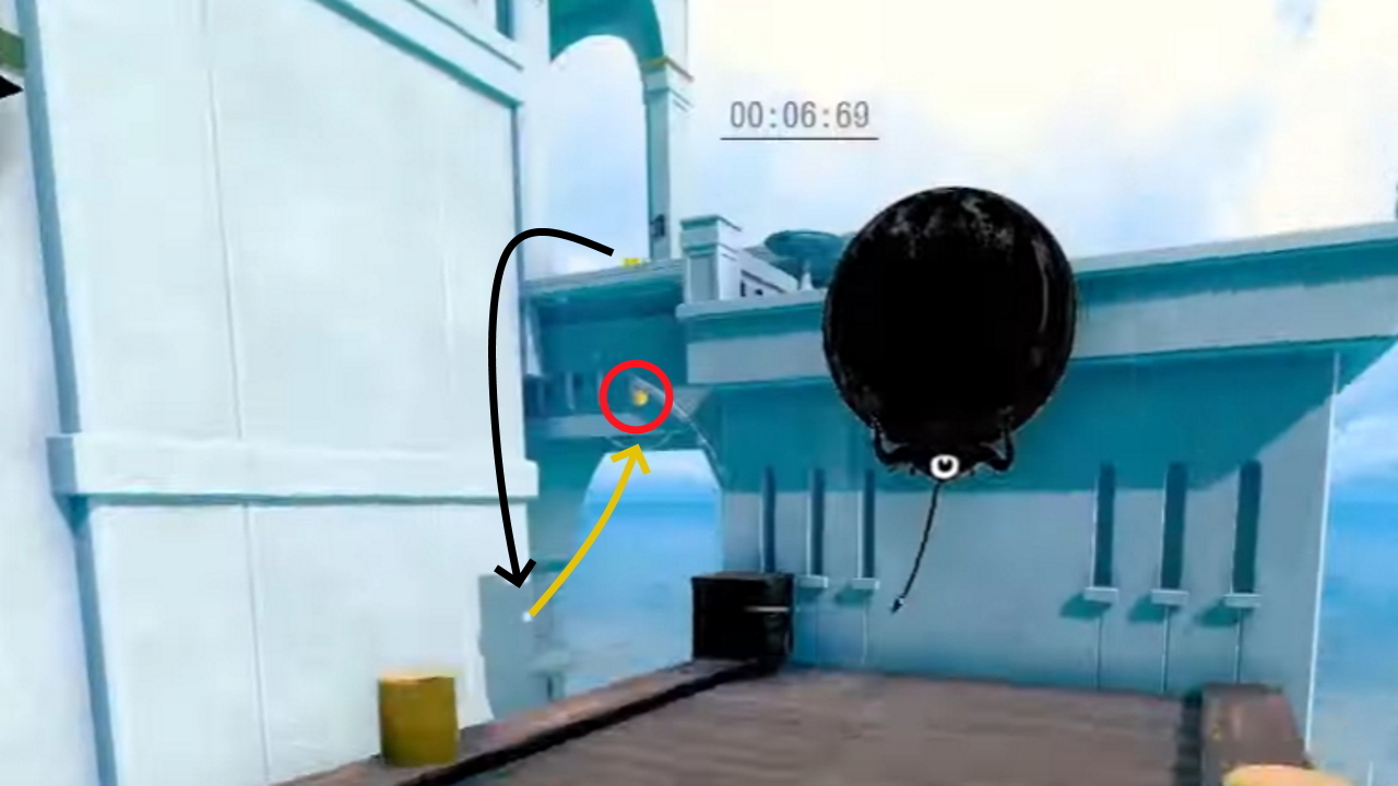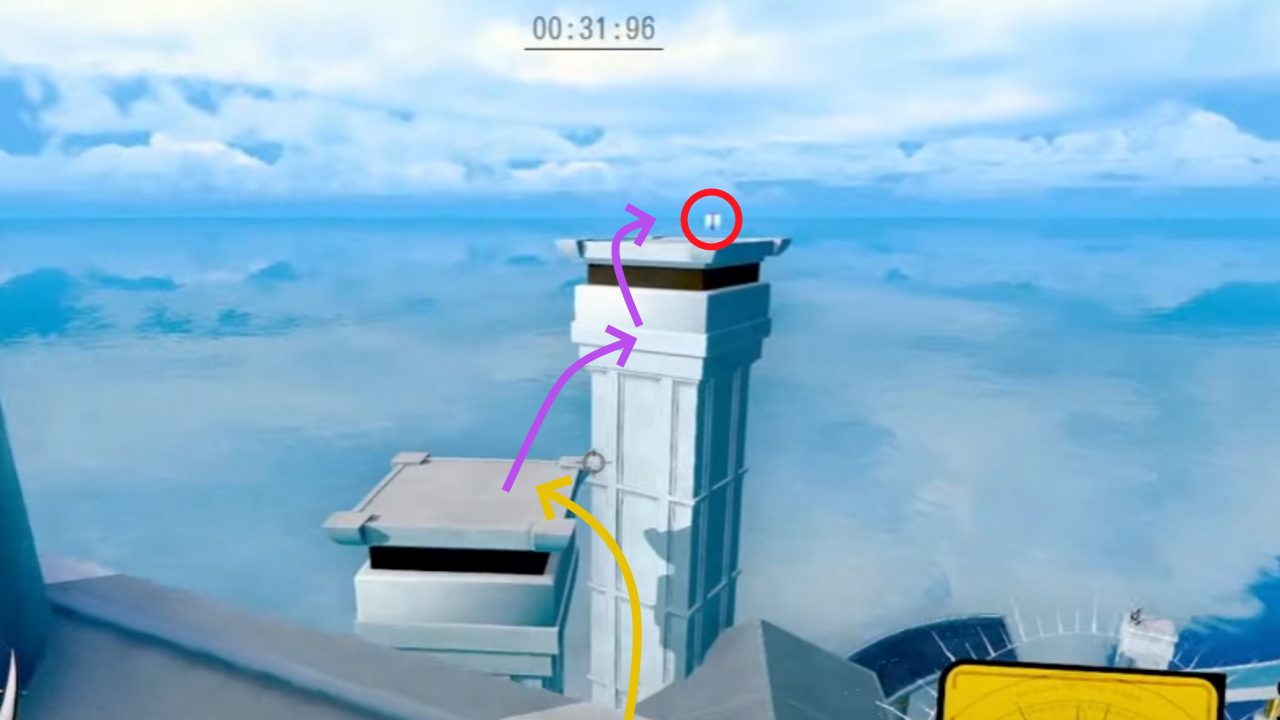 Get to the end of the level with a pistol and 2 rifle cards. From the end goal, use the pistol jump to get across to the first roof. Use a rifle bomb to launch yourself at the pillar, and the second on the side of it to boost yourself to the top.
