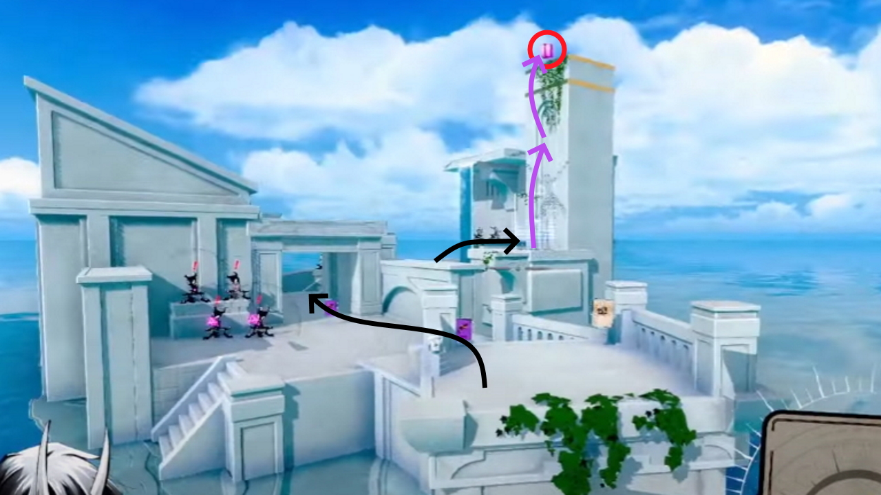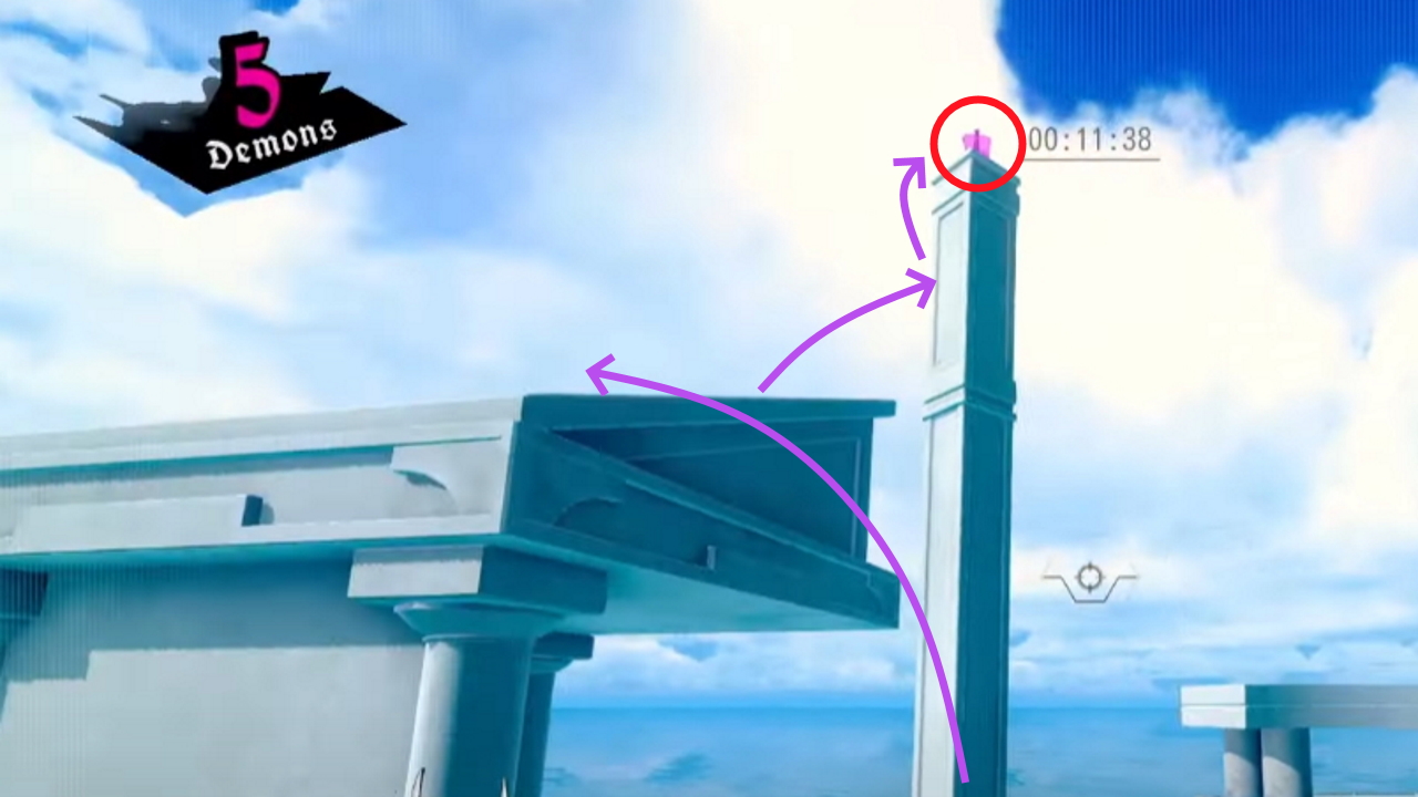 It’s inside the pillar to the right of where you start. Shoot the demon on the right of you to get his pistol card, then use one jump to get up to the next platform, grabbing the pistol card that’s in the air so you have two. Use one to jump into the first pillar and the second to jump to the second pillar.