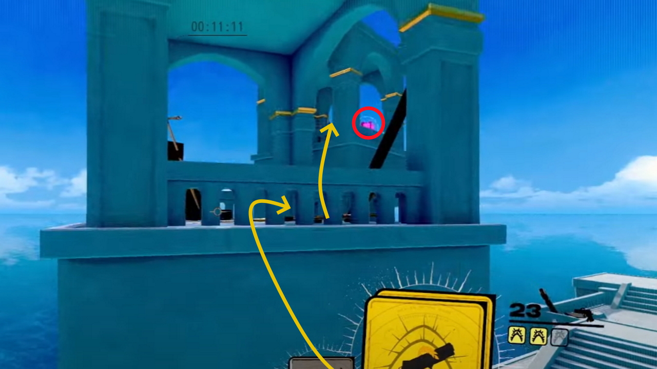 Pretty easy to miss, it’s hiding underneath this bridge that you pass at the start. Grab the pistol card and jump off the side of the bridge, then use the pistol jump to propel yourself under the bridge and grab it.