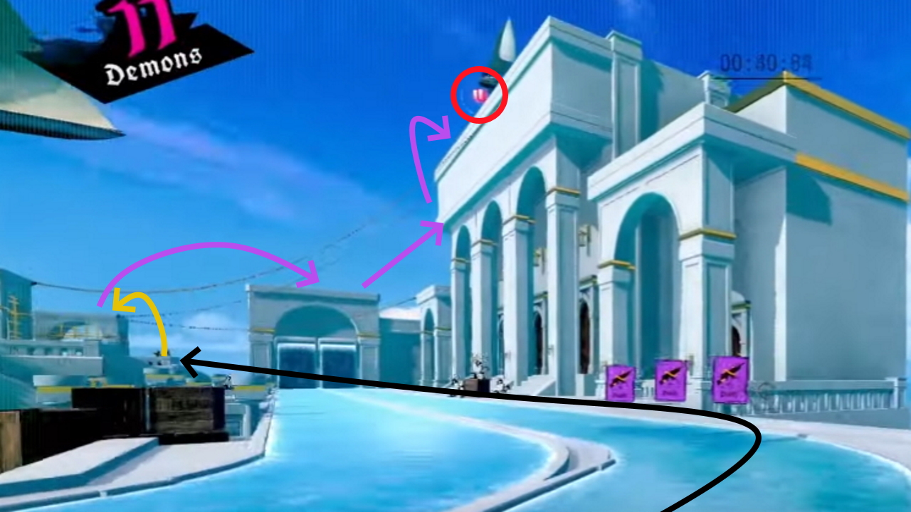 Move through the level saving the three rifle cards. Use the first to jump up onto this roof, the second to launch yourself at the pillar, and then shoot the third at the pillar as your launched into it to boost yourself up to the top.