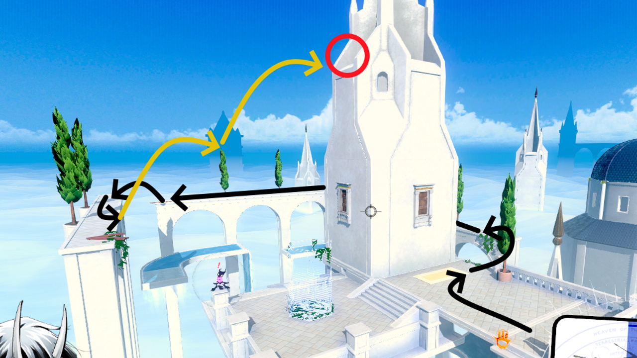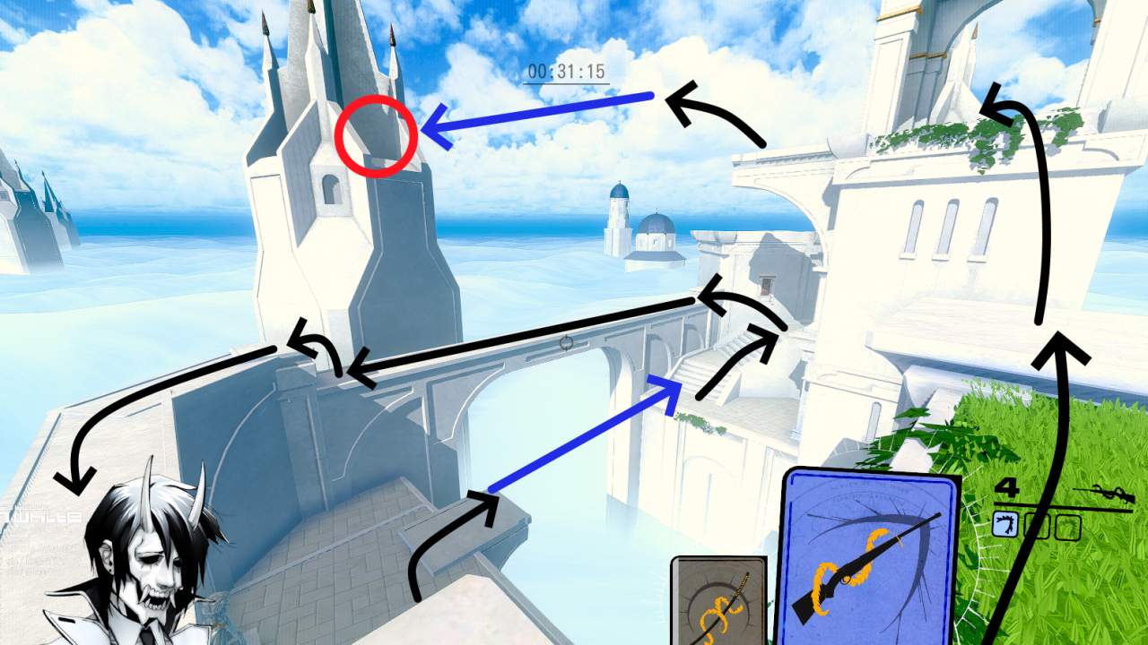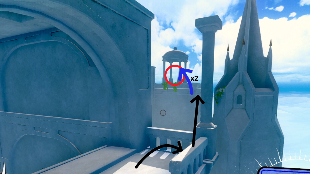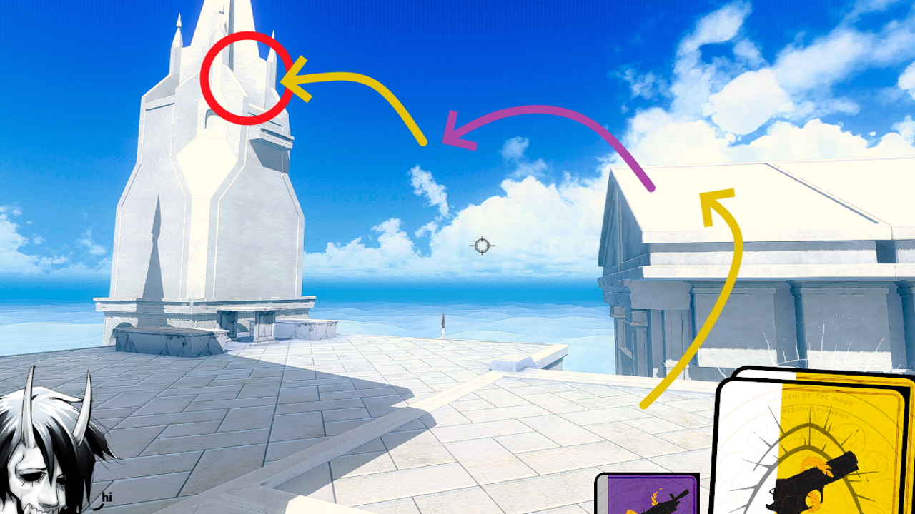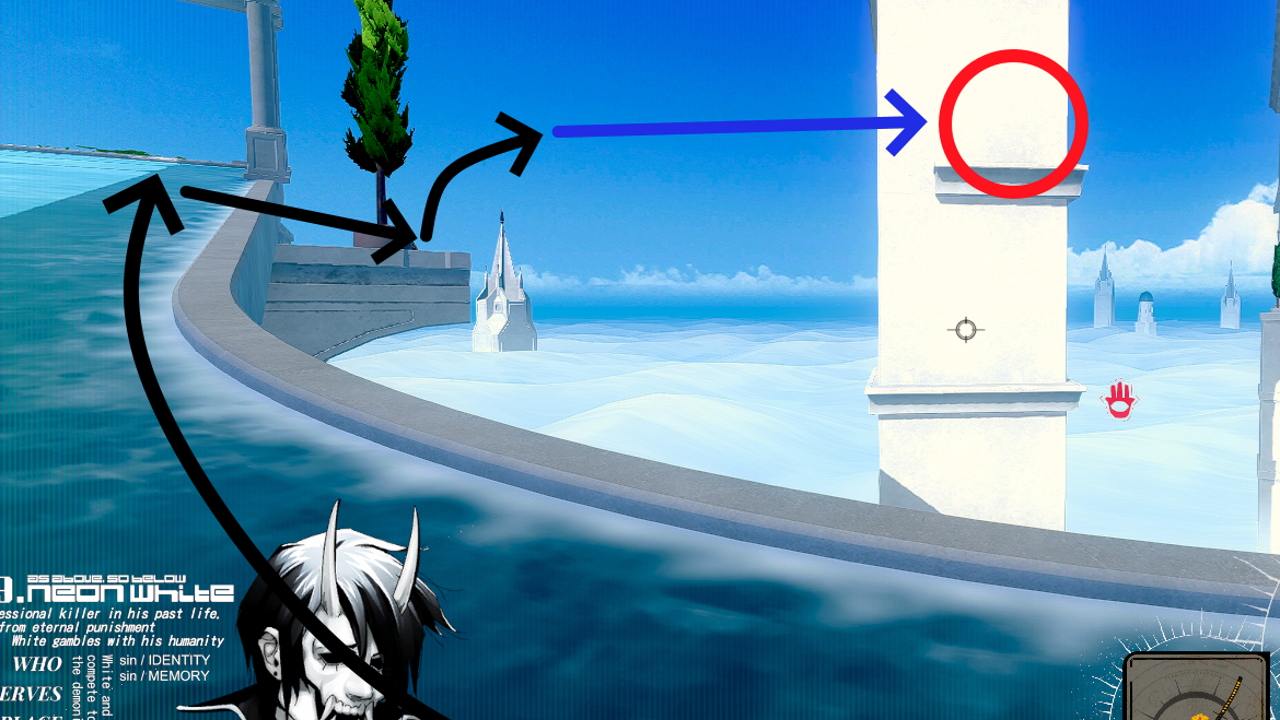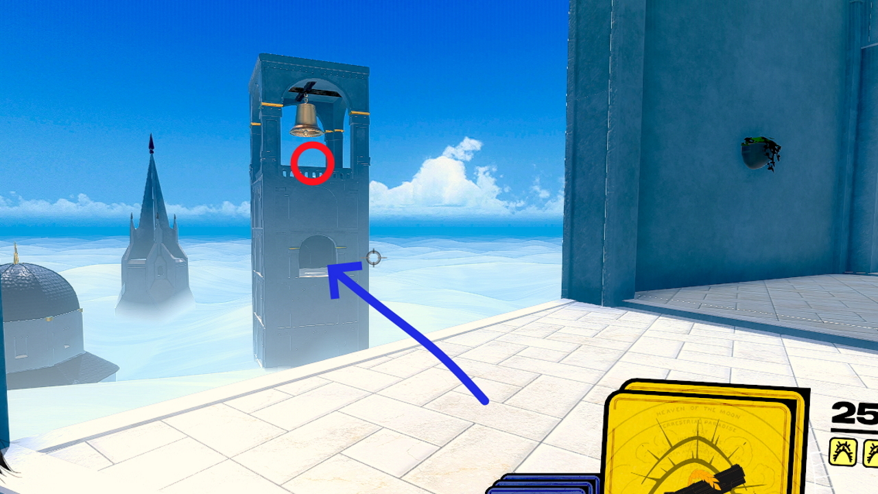 This one can be kind of hard as it involves a very big dash over to this tower in the distance. Move through the level saving dashes when possible. You need to have 3 dashes and two pistol jumps here. the two pistols can be obtained by going to the vending machine further into the level. Once you’ve done this, jump off and use your three dashes to reach the tower. Once you reach the inside, you can follow the path and use your two pistol jumps to reach the top where the present is.