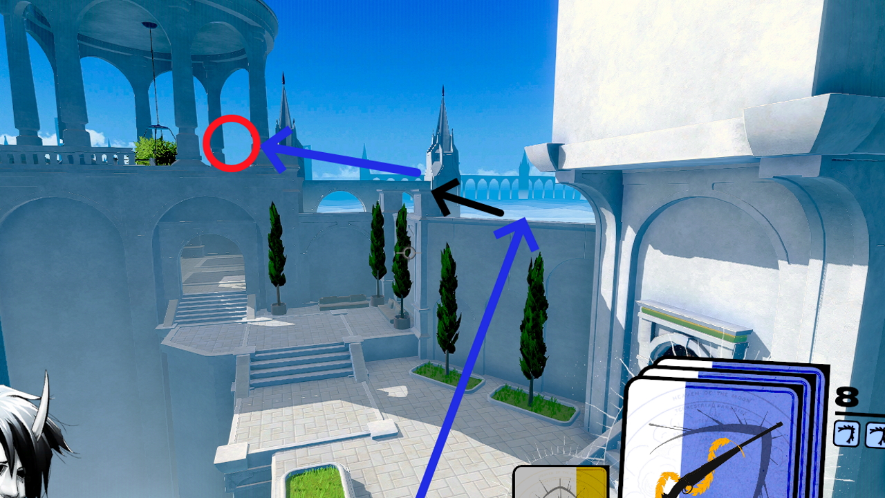 Sits inside a Gazebo to the left of where you kill the blue demon after jumping up. Reach this point with two dash cards, and then use both of them to dash the present.