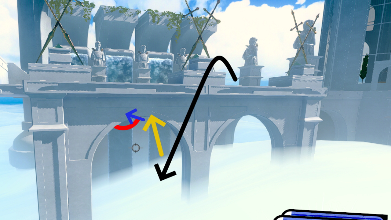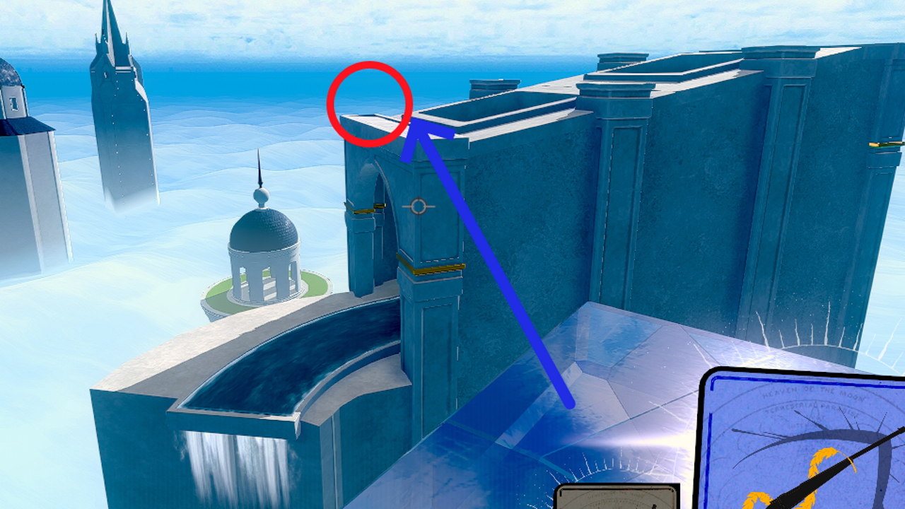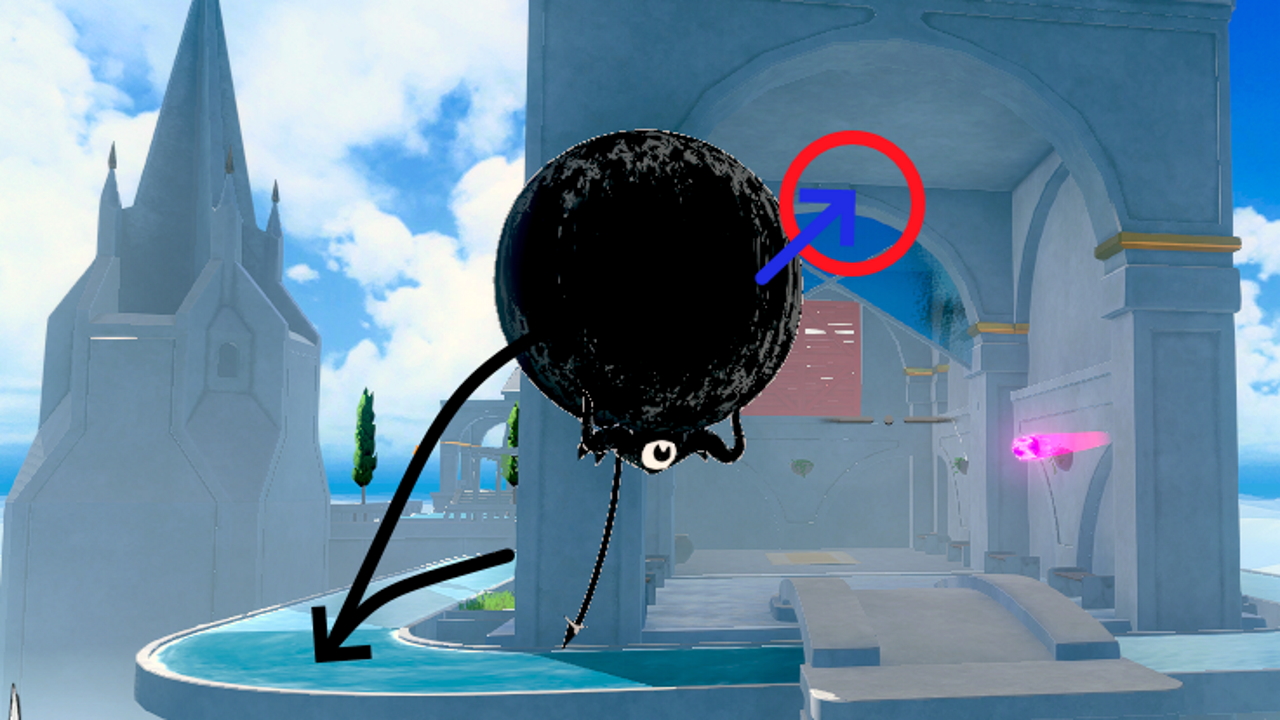 This present is behind this glass wall, up in the air, inside the building that the water stream runs around. Get here with a dash ability saved from the part before, and then jump on this balloon demon. Immediately turn around and dash towards the present to reach it.