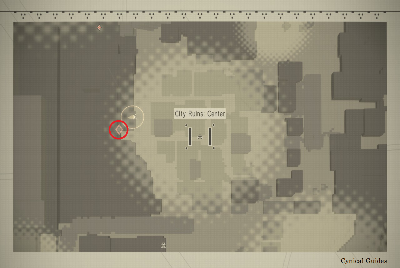 There will be three Red “???” Dots marking Sub Quest locations in this area. One is the Factory Entrance Access Point; another is way below the others & can be found a lot later in the Flooded City. The third Sub Quest will be the location of Virtuous Treaty. It can be found stuck into the concrete at the beginning of the long causeway where we fought the Goliath-Class Machine during the Prologue.