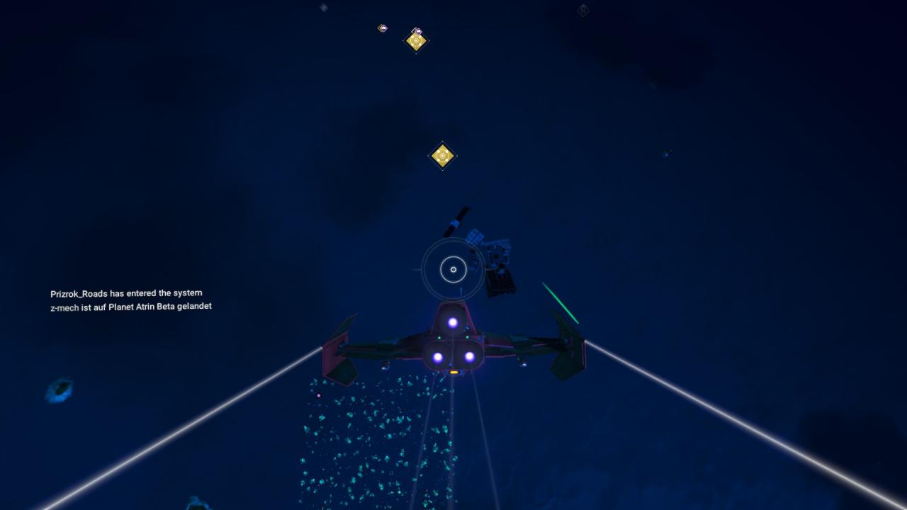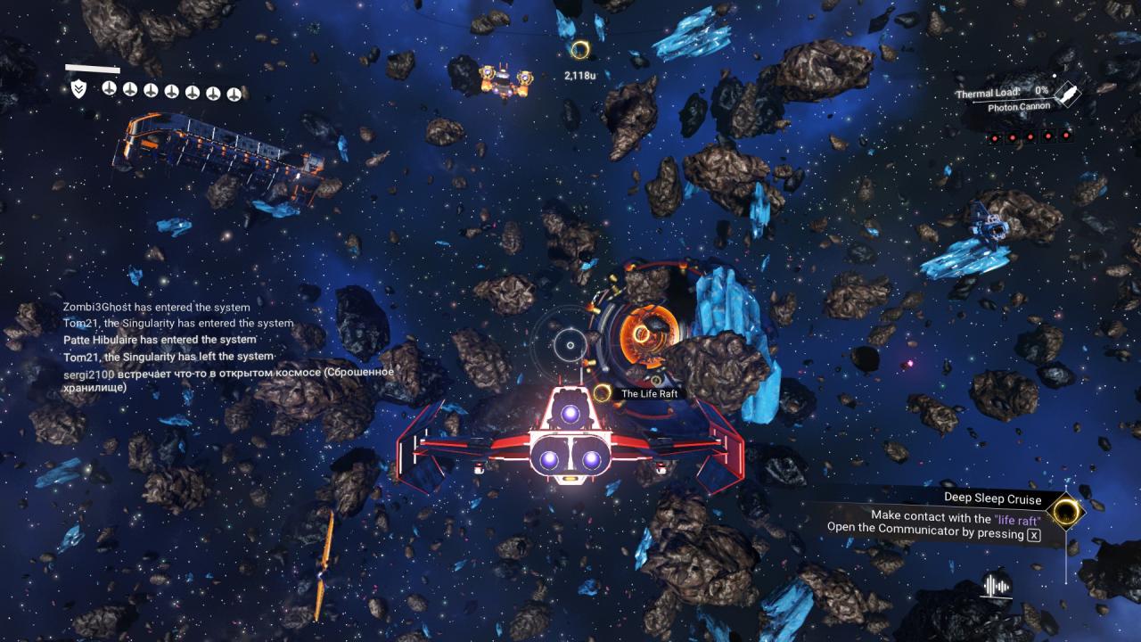Activate Homewold Repeater device, fly in to space and activate Pulse drive. A few moments later you will recieve message thas you met something. Stop, and you will see “Life Raft” spaceship, and Sentinel ship nearby. Try to contact with it with “X” key, read the story. Then fly away and escape sentinels.