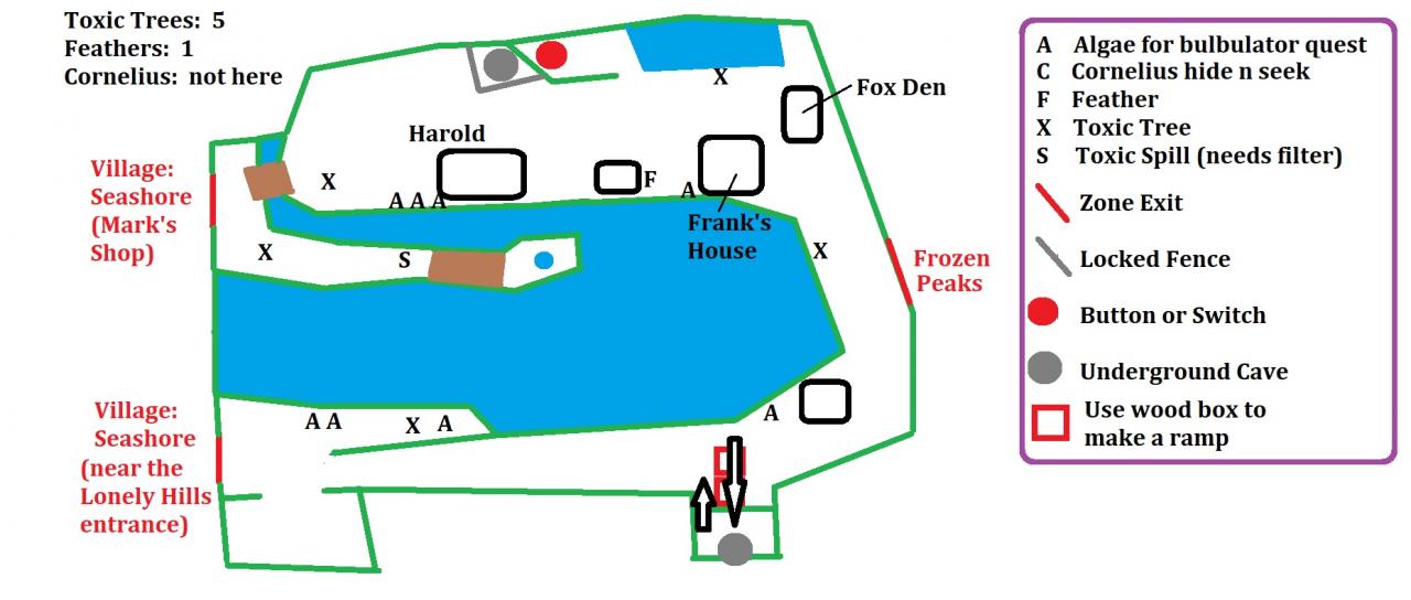 • In Lonely Hills after you befriend five ducks, the quest tells you to return to Frank; this is wrong – return to Harold instead. Specifically, return to his shop in the back end of Lonely Hills.