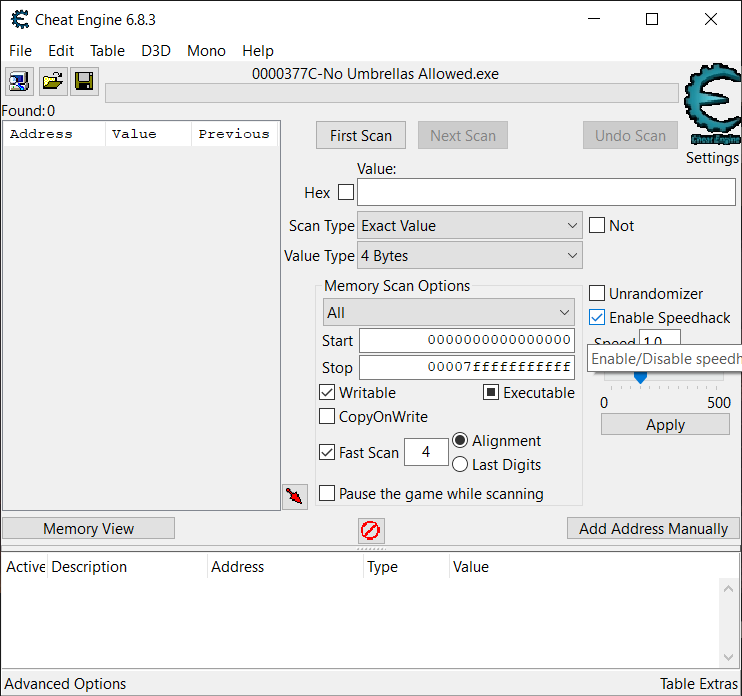 - Tick the box that has enable speedhack beside it. Then change the number in the box that appeared after you ticked the box. Change it to something like 2 or 3, which will multiply the speed of the game by that amount. Then click apply. Then… you’re done, the game’s faster now.