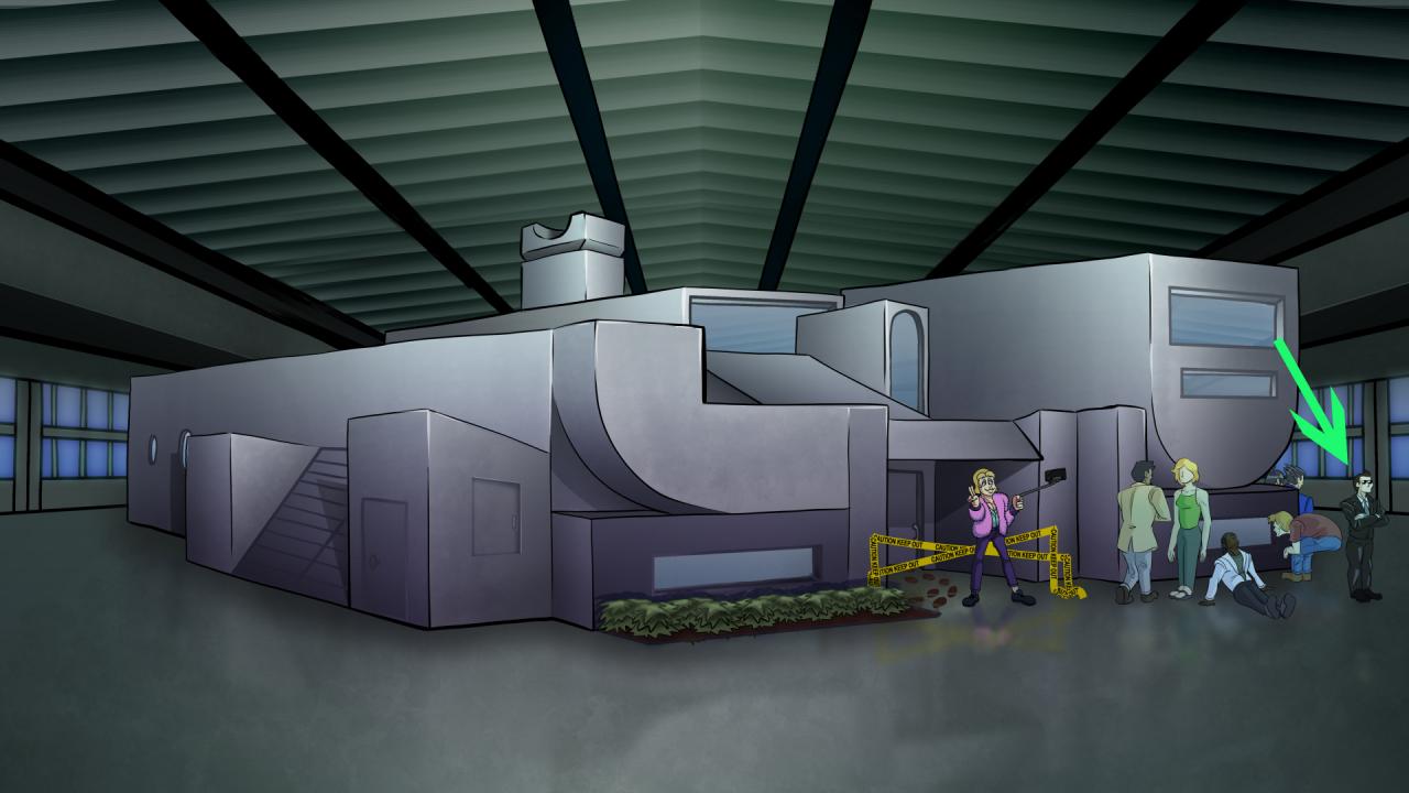 In Act 1, go to the Warehouse and examine the man in a suit near the crowd.