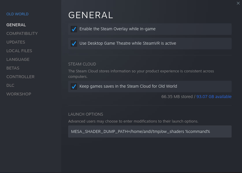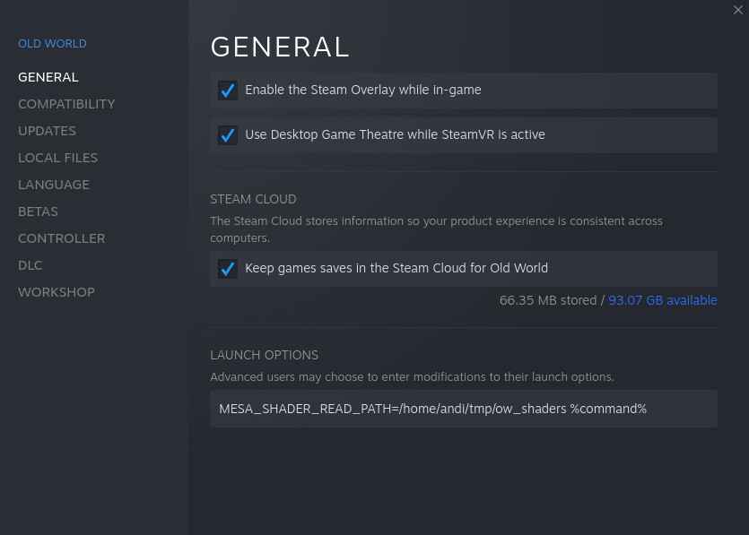 What those edits do is that they search for `texture()` calls that sample either `_GlobalFogMaskHigh` or `_GlobalFogMaskLow`, and they replace the y-component of the coordinate parameter by `1.0-y`. - Now that your files have been modified, you can add the `MESA_SHADER_READ_PATH` setting to your launch options for Old World.