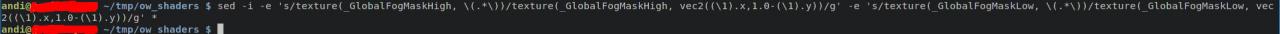 sed -i -e ‘s/texture(_GlobalFogMaskHigh, \(.*\))/texture(_GlobalFogMaskHigh, vec2((\1).x,1.0-(\1).y))/g’ -e ‘s/texture(_GlobalFogMaskLow, \(.*\))/texture(_GlobalFogMaskLow, vec2((\1).x,1.0-(\1).y))/g’ *