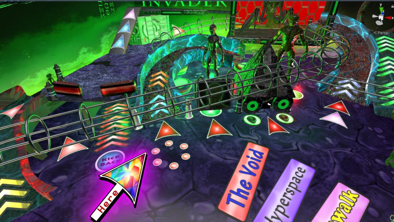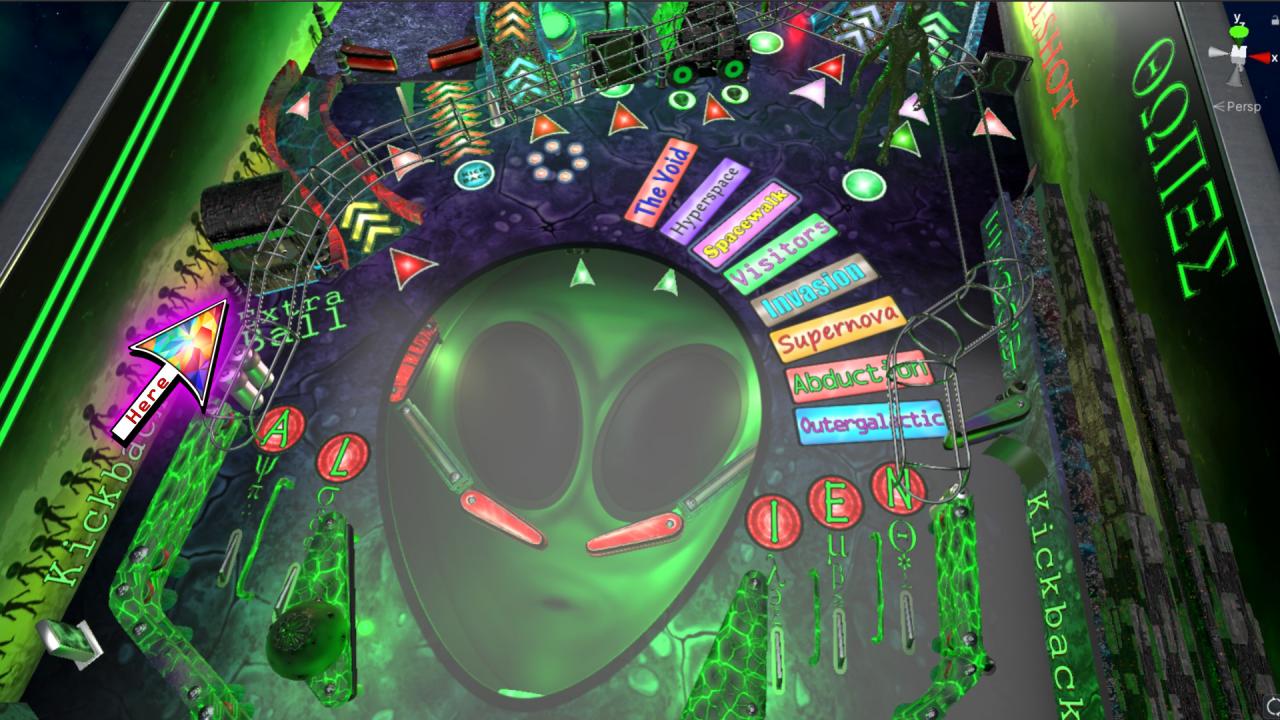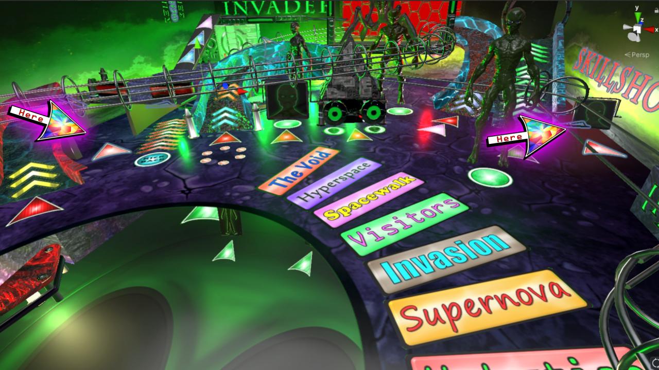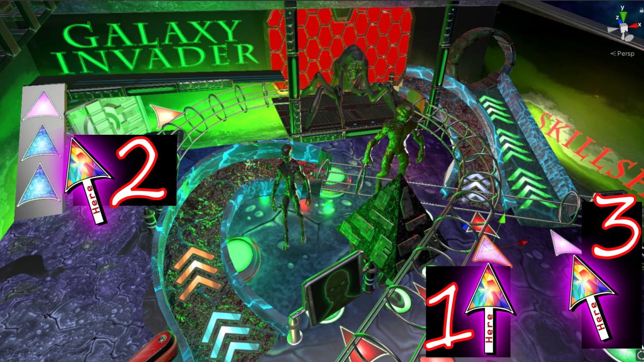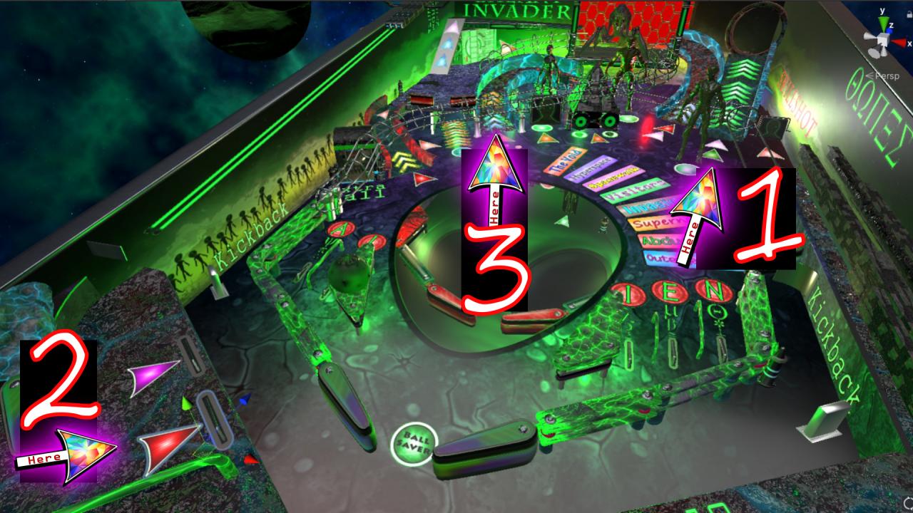 To enter the bottom playfield you must complete the “Visitors” mission. Once you are on the bottom playfield you must hit the alien drop targets, with the final alien target located in the back. Each Alien has a green arrow to indicate where to shoot the ball. If all three aliens are hit the ball will roll down the chute and activate the multiball mission.