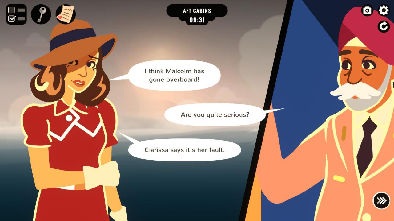 For example, if you kill Carstairs, he won’t present the earring. If Clarissa is convinced to confess, the meeting will end when she first talks. - There are a boggling amount of ways to correctly or incorrectly handle a specific problem. For example, one problem you face is that you lost your other diamond earring on deck when you pushed your husband overboard, and if not nipped in the bud, this will tie you to the crime scene.
