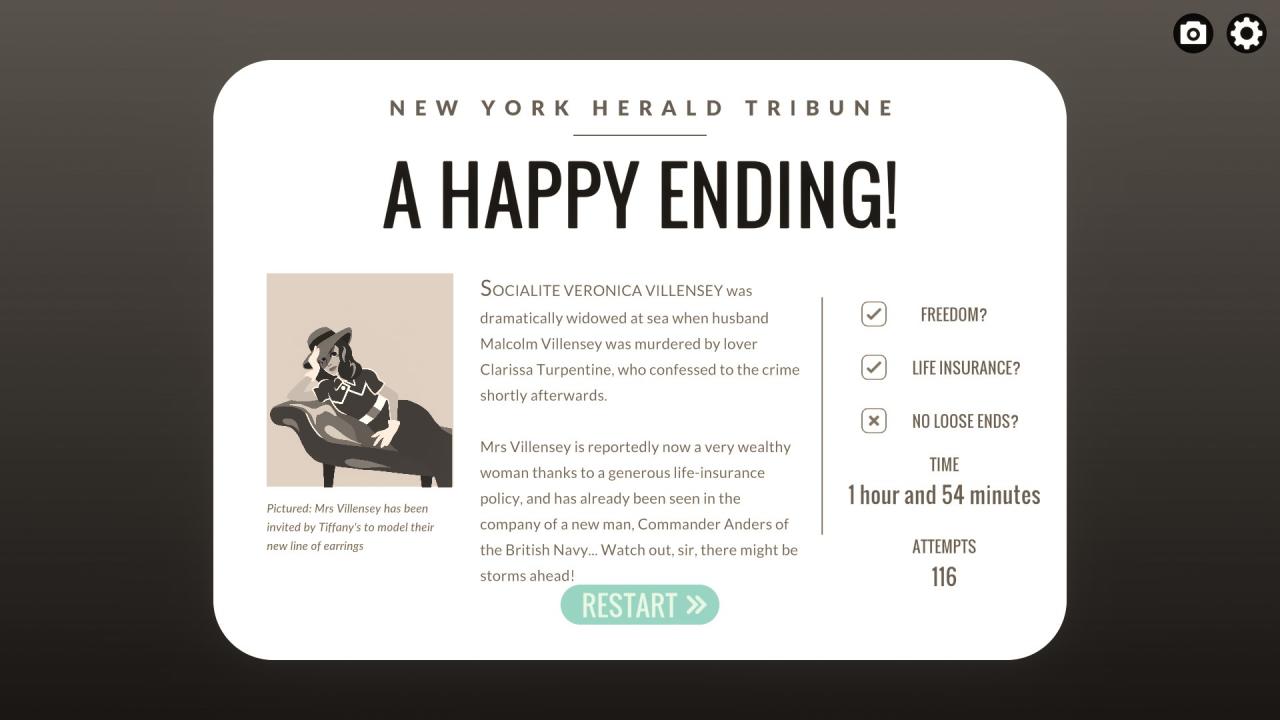 No Loose Ends: Best ending. Have Lady Armstrong taken away for murder so she can’t blackmail you. For this route, you need to get your hands on the blackmail photograph she keeps in her room, give it to Anders, and then pin the murder on her in the meeting.