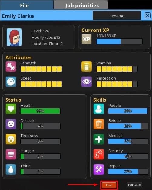 → Might be confusing because it’s either possible to fire an off-shift staff member from the Staff Tab ; OR to fire an on-shift staff member from its Staff File.