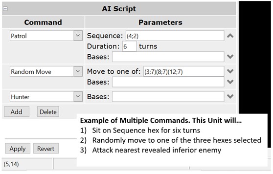 – Multiple Commands can be stacked on a unit to create a somewhat advanced/unpredictable AI. Example: (Patrol>Random Move>Hunter) Good combo for AI second wave counter attacks.