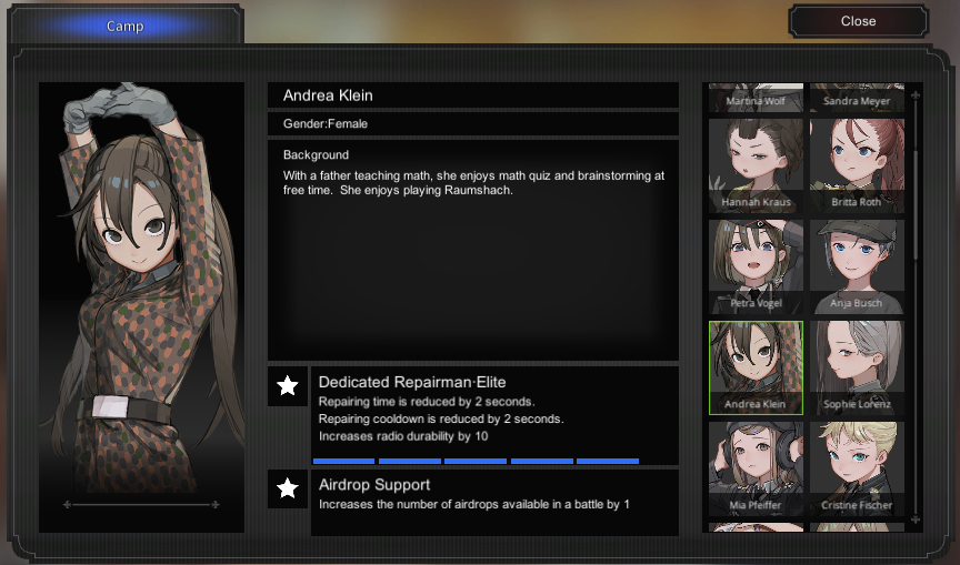Each individual crew member gives a special and specific boost to a tank’s performance, each with its own male and female variant. As you upgrade each individual crew member, they gain upgraded stats and unlock new traits to further expand your arsenal. Some of these can be unremarkable or can be absolutely amazing. The best being (in my opinion) those who increase the carry amount for AP rounds, who also let you carry about 10 more APCR, which is a crazy good upgrade, and saves off on the amount of supply drops needed, whose uses can also be increased by crew members. On that topic, there are certain bonuses you can get based of character relations. Each member is linked to another, usually having their stories intertwined. If you play with both specified characters on a designated map, you unlock their “friendship bonuses”, which are stronger attributes that can seriously help you in battle and are worth the trouble. My recommendation is to unlock each character and play with them on their designated map so you don’t have to go back and redo mission just to unlock the bonuses for the achievement. That is, of course, if you don’t want to go back and destroy enemies in your Königstiger later. Up to 5 members can be but into tanks depending on the type, and give huge bonuses when all put together. Crew is definitely worth upgrading.