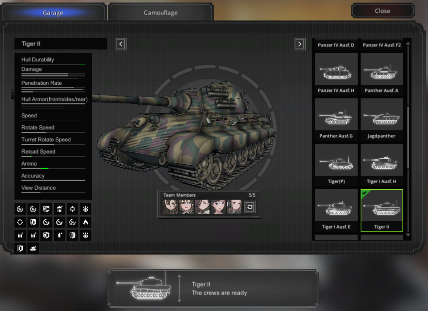 The game offers a selection of largely german tanks, with a couple of Soviet, French, and British tanks that will be talked about later on. The selection isn’t large enough to offer massive replayability, but it’s good for a couple more playthroughs. There are really 2 types of tanks available. Your standard traversables and the assault guns, which consist only of the StuG III and Jagdpanther. The roster mostly consists of the most famous tanks from the listed factions, and even has the KV-2, which can be unlocked for free after completing a mission later on in the story (which unfortunately isn’t long). It even has the exact same model of tank the Anglerfish team uses in Girls und Panzer, so I guess you can roleplay that in tandem with the GuP crew member pack mod on the workshop. The progression of tanks is fairly simple, and I would recommend that you skip some tanks to save up for more powerful ones instead. Tanks can range from underwhelming to absolutely indomitable at times depending on if you were smart and saved up for the best tank, which can no-joke carry you through half the game. Spend wisely, and once you beat the game, THEN you can farm medals for the rest of the tanks. There are also camos available for most tanks at the cost of 2000 medals each, most of which look pretty nice. Just play the game how you want to, and smoothly progress through the game!