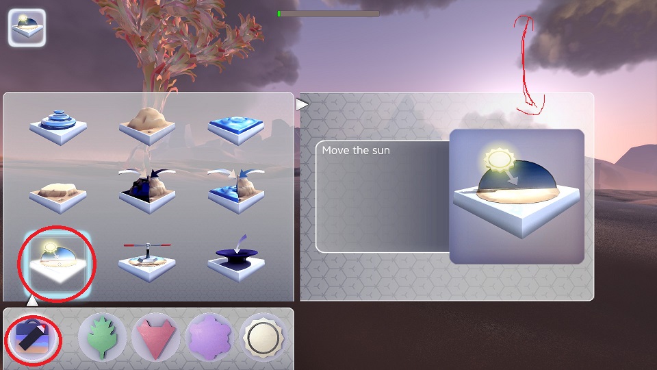 Start a sandbox game, open the item placement panel. Select sun, then find it on the sky and pull it down to the horizont.