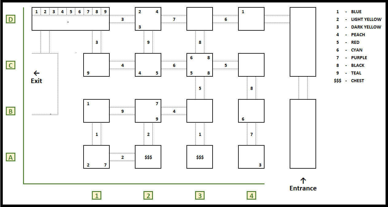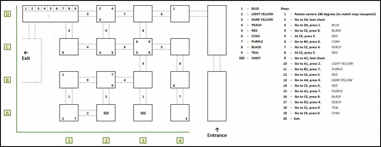 Below I have a mapped layout of the arena and a complete solution to reach the exit while grabbing both chests along the way.